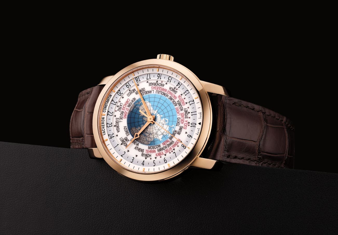 The watch features a revolving chapter ring with names of 37 cities and the centre of the dial features a Lambert Projection world map that lines up with the names of the cities.