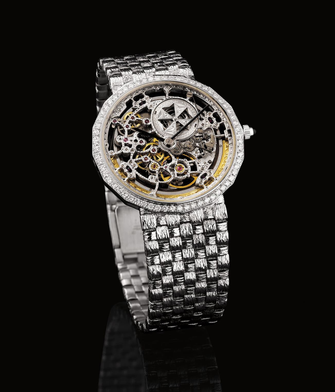 The present white gold example is fully skeletonized highlighting the finely crafted movement. The bezel is further adorned with diamonds, displaying a degree of precision and finesse.