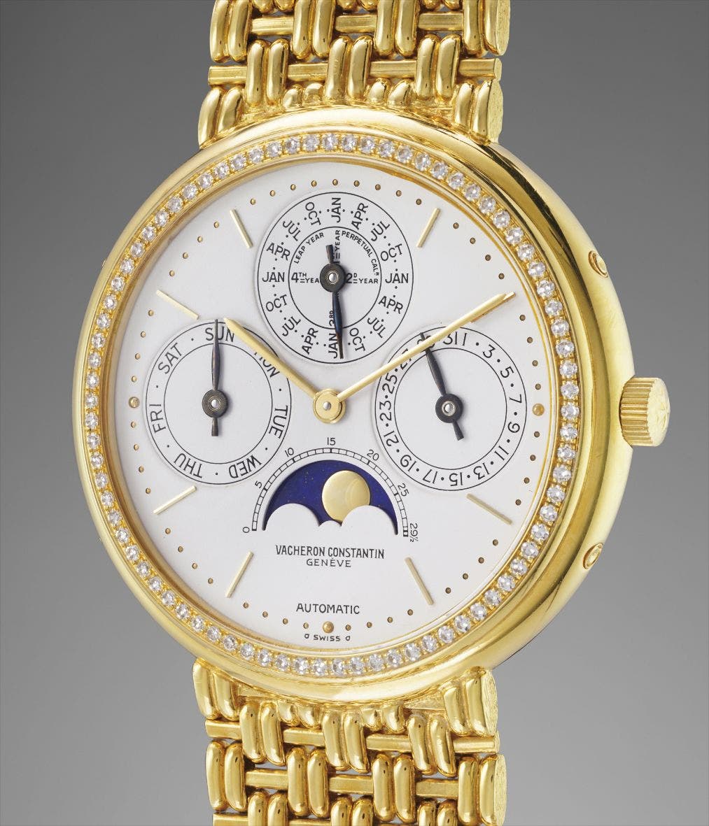 The present movement is furthermore modified with a perpetual calendar complication, which is remarkable, considering how thin the case is. The watch is fitted with a heavy and luxurious integrated woven bracelet, and a diamond set bezel, offering immense value and history for the collector and scholar.