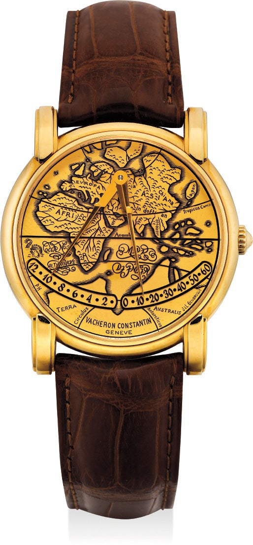 江詩丹頓,「麥卡托」型號43050 ,18K黃金自動上弦腕錶,配歐亞地圖22K黃金錶盤、雙逆反指針顯示小時及分鐘,約1995年製。附錶盒、保證書、調整筆、放大鏡