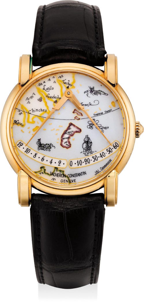 江詩丹頓,「Mercator」型號43050,精細及十分罕有,限量版18K玫瑰金自動上弦腕錶,配東亞及台灣地圖彩繪內填琺瑯錶盤、雙逆反指針顯示小時及分鐘,限量發行26枚,編號第8號,約1998年製。附錶盒和證書