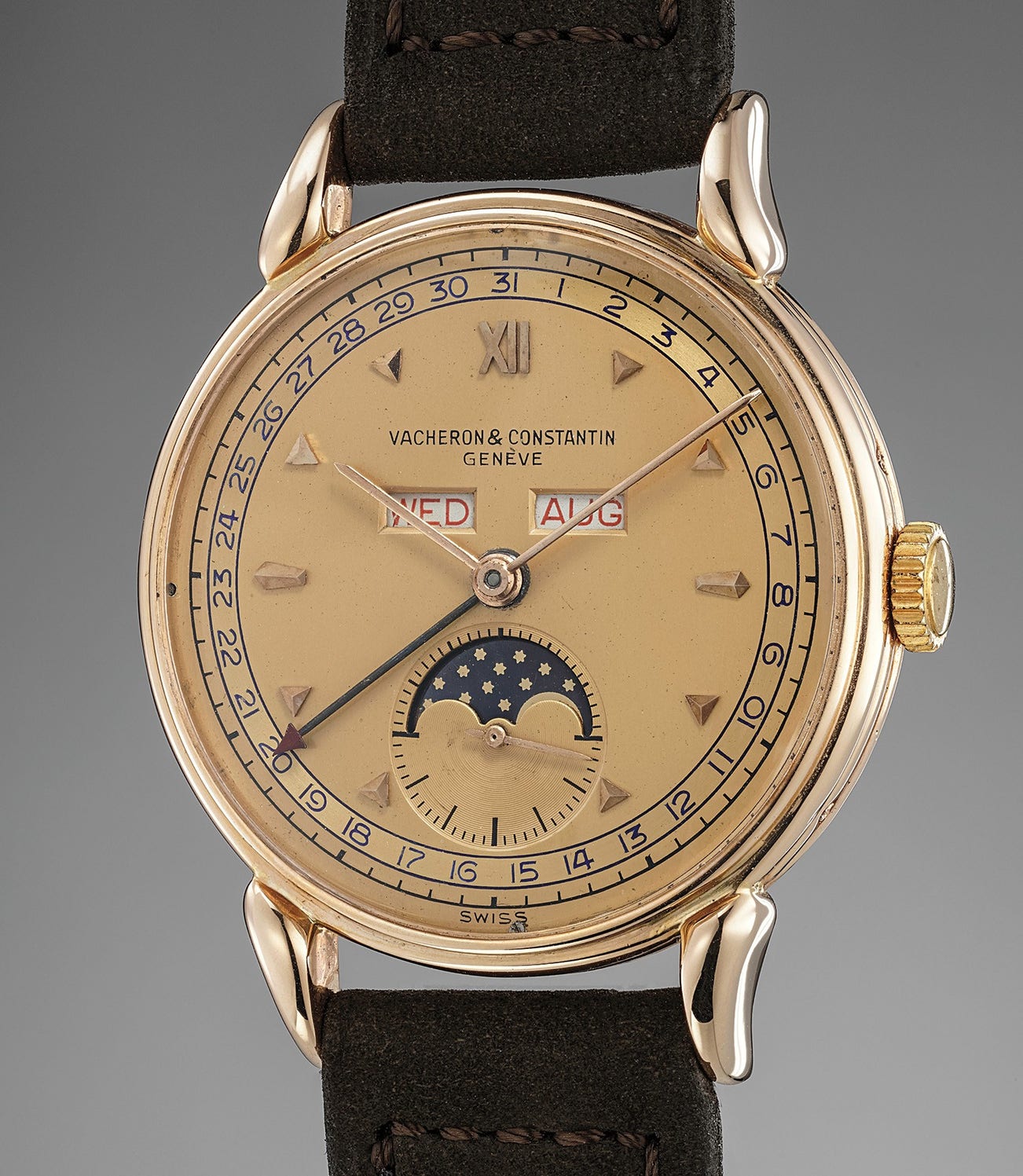 A fine and very rare pink gold triple calendar wristwatch with moonphases and pink two-tone dial