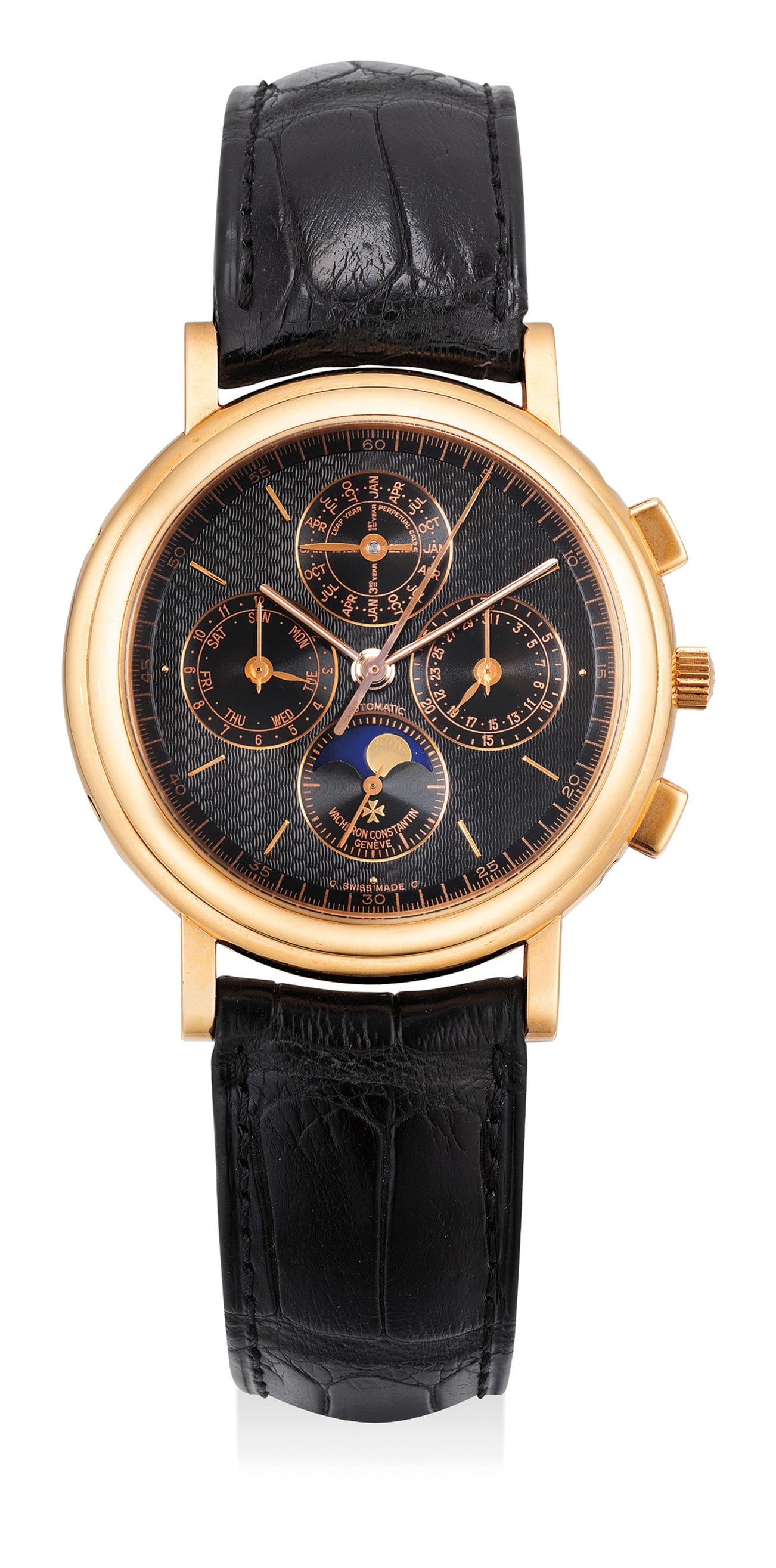 江詩丹頓,型號49005/1,精細,18K玫瑰金腕錶,配萬年曆、計時功能和月相顯示,1995年製。附後補證書
