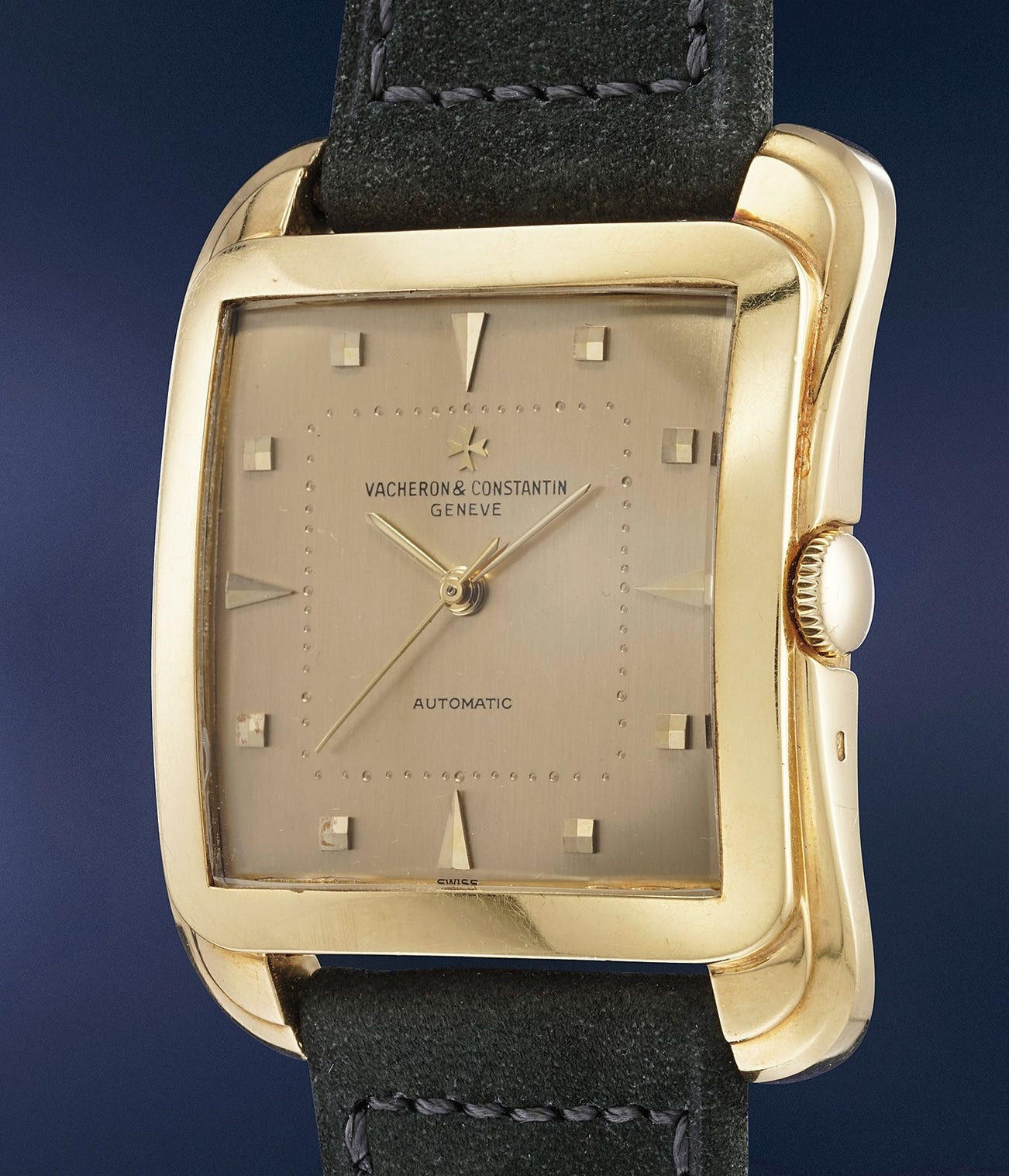 A fine, large and unusual square-shaped wristwatch with center seconds and champagne dial