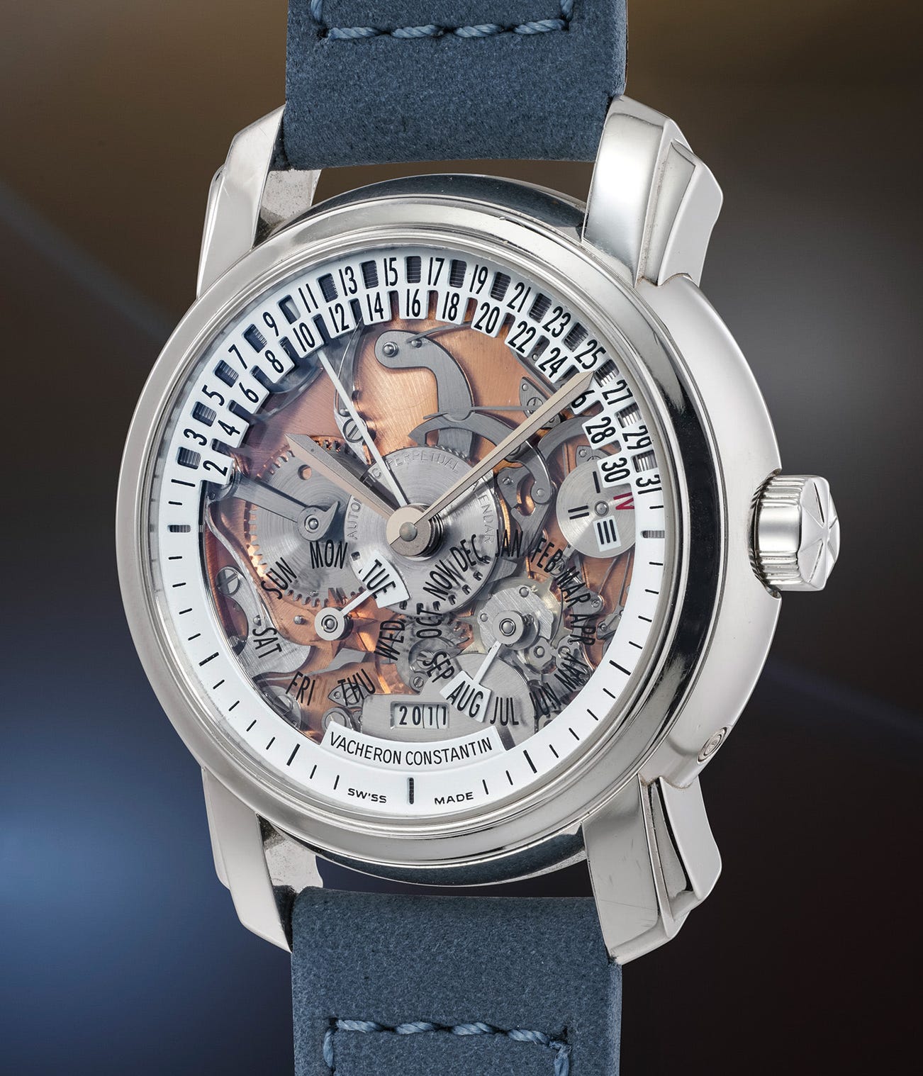 江詩丹頓,精美,鉑金萬年曆腕錶,備逆返日曆、年份顯示。附原裝證書及錶盒