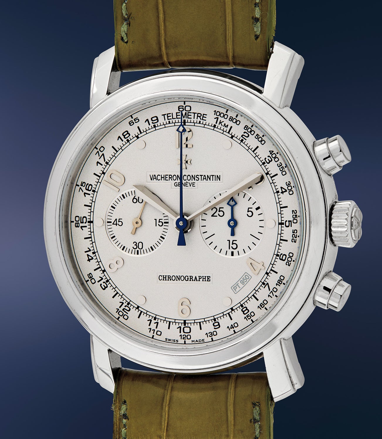 江詩丹頓,罕有、大型、精美,鉑金計時腕錶,備噴砂鉑金錶盤、測距刻度,限量發行75枚,編號第30號。附原裝證書及錶盒