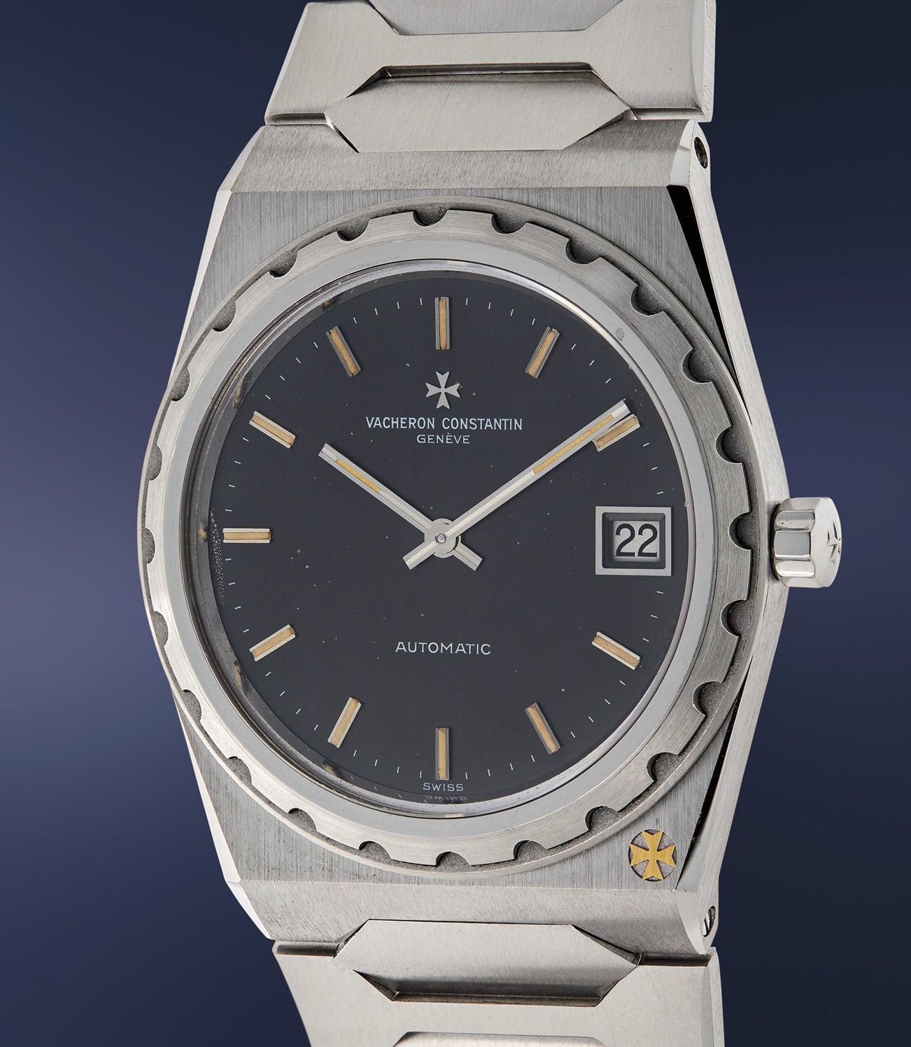 Within the 222 lies the ultra-thin, automatic calibre 1121, Vacheron Constantin’s version of the renowned Jaeger LeCoultre calibre 920 used in the earliest Patek Philippe Nautilus models and the Audemars Piguet Royal Oak “Jumbo”. The scalloped bezel and the hexagonal flat links of the bracelet, as well as the small Maltese cross inset to the case differentiate the design of the 222 from its luxury sports watch competitors of the era. Produced for only seven years, with a total of 500 pieces made in all metal and dial combinations, the 222 commemorated the 222nd anniversary of Vacheron Constantin. Offered with its hardly ever seen original Certificate of Origin, special 222 box, and in well-preserved condition, this oversized luxury sports watch and ancestor of today’s Overseas model is ideal for the discerning collector seeking the uncommon.