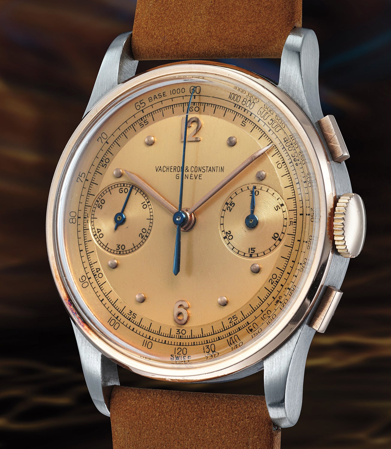 Two-tone cases in vintage watches not only have a certain graphic beauty but the mix of a white metal (steel, white gold, platinum) with a colored metal (pink or yellow gold) gives the watch incredible presence on the wrist. The present reference 4072 in steel with pink gold bezel, crown and chronograph pushers is a wonderful take on a classic design with a twist.