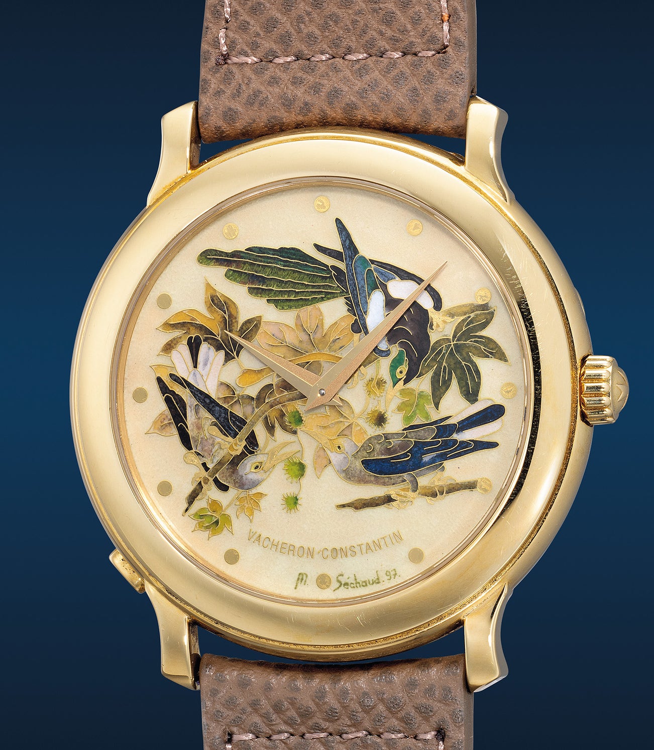 江詩丹頓,「"Audubon" Collection, Birds of America」型號43060/000J-8625 ,十分精細有,限量版黃金自動掐絲琺瑯腕錶,當代琺瑯大罕師 Muriel Sechaud 臨摹法裔美國畫師 Jean-Jacques Audubon 畫作「 Yellow-billed Magpie and Clark's Crow」,1997年製。附後補證書