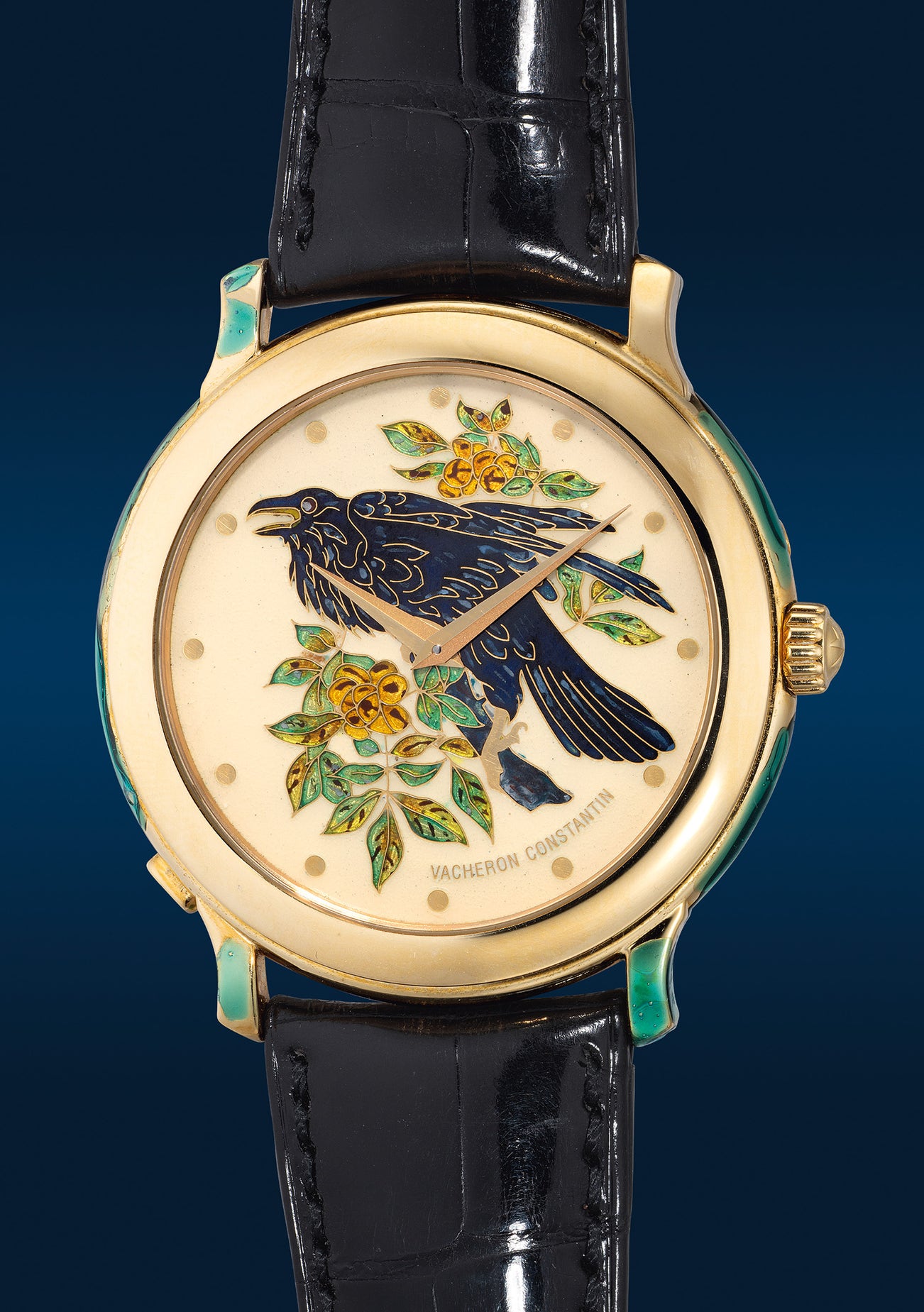 江詩丹頓,「Audubon Birds of America」型號43060/000J,十分精細,黃金自動掐絲琺瑯腕錶,臨摹法裔美國畫師 Jean-Jacques Audubon 畫作「 Raven」,約1997年製。附原裝證書、錶盒