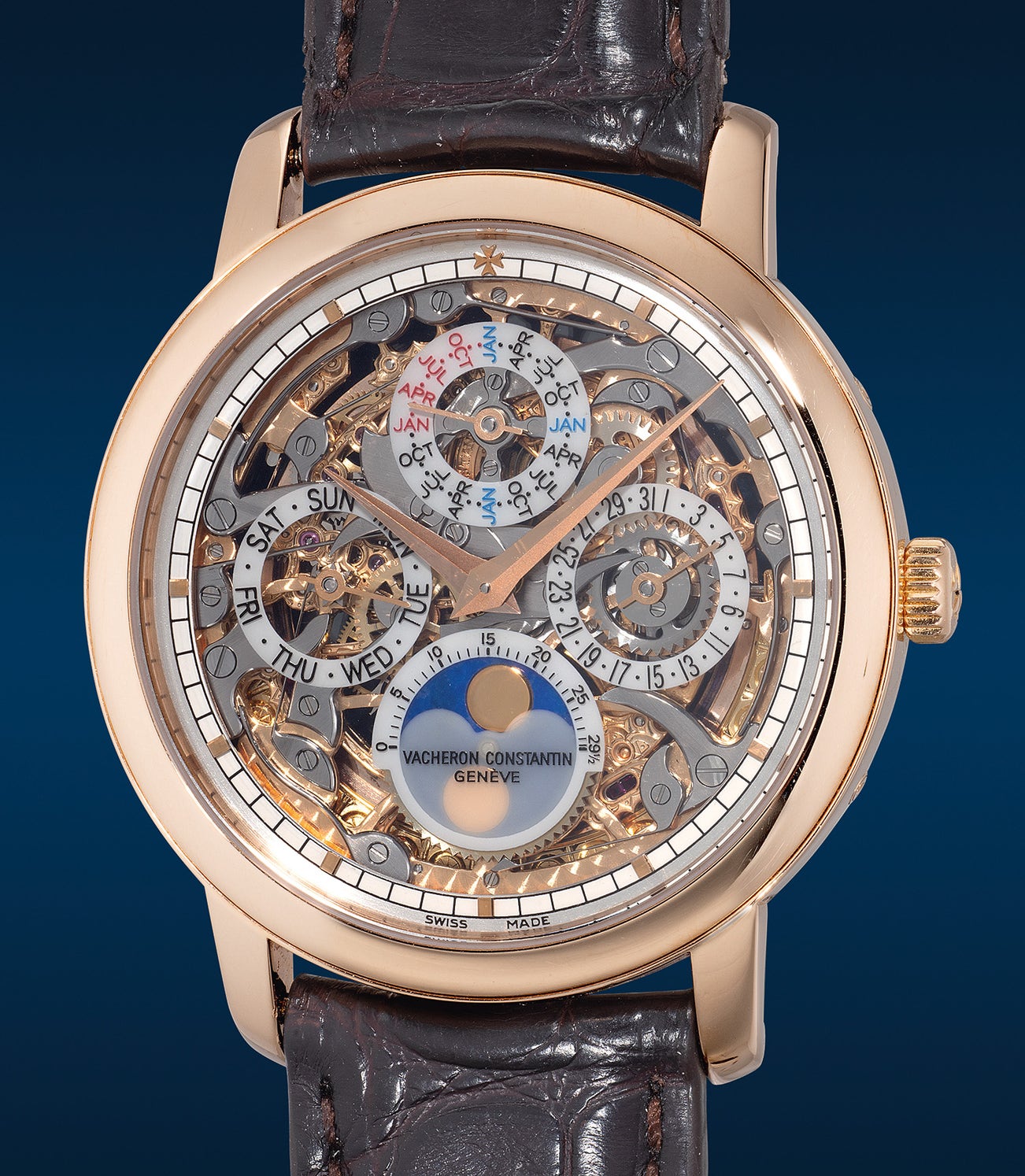 江詩丹頓,「Traditionnelle Perpetual Calendar Squelette」型號43172/000R-9241,精細,玫瑰金鏤空自動萬年曆腕錶,備月相、閏年顯示,約2013年製。附原裝證書、錶盒、調整筆