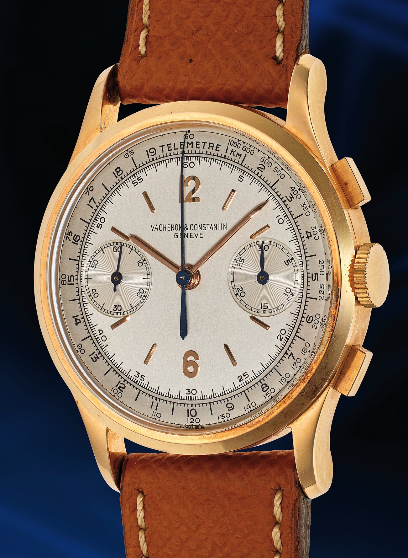 While many collectors associate Vacheron Constantin with their iconic 1970s 222 sports watch, they should also be remembered for their stunning chronographs of the mid-20th century. The present pink gold model is a well-preserved and attractive example of this notable vintage timepieces.