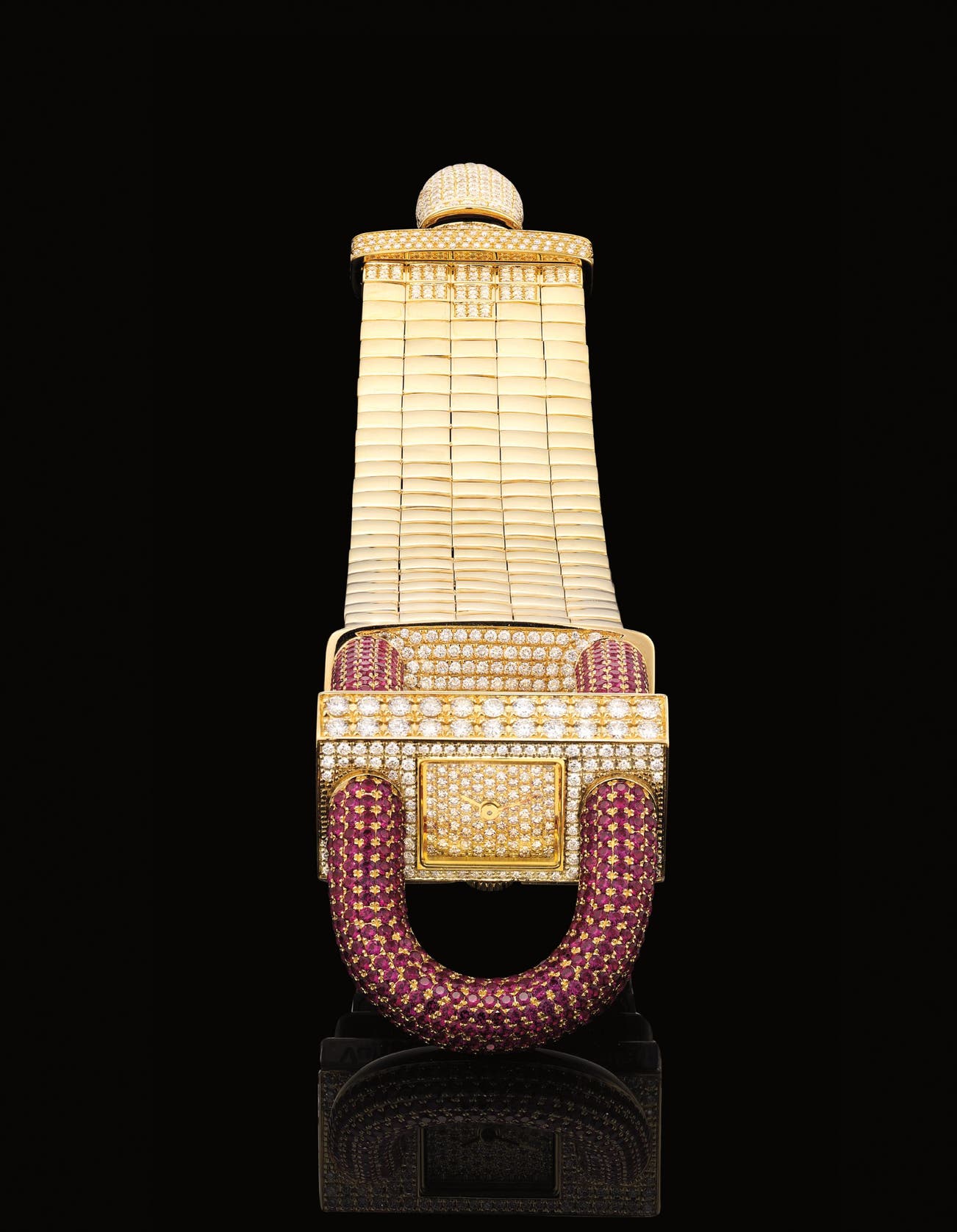 The present model is lavishly set with pavé-set diamonds and rubies, highlighting the jewelry aspect of the Cadenas watch. While retaining its essential character, the watch is set with a very flexible yellow gold and diamond-set bracelet to accentuate its brilliance. The watch has furthermore been retained in almost unused condition.