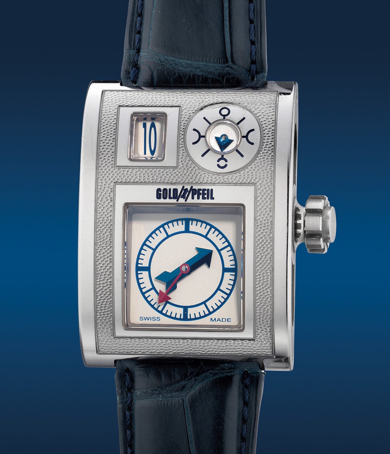 Inspired by vintage rangefinder cameras with their fitted leather GoldPfeil cases, time is expressed through the three sub-dials: minutes (the blue "GoldPfeil" arrow) and running seconds, jump hours in the window on the left corner, and a moon phase illustrated by stylized glyphs around the subdial.