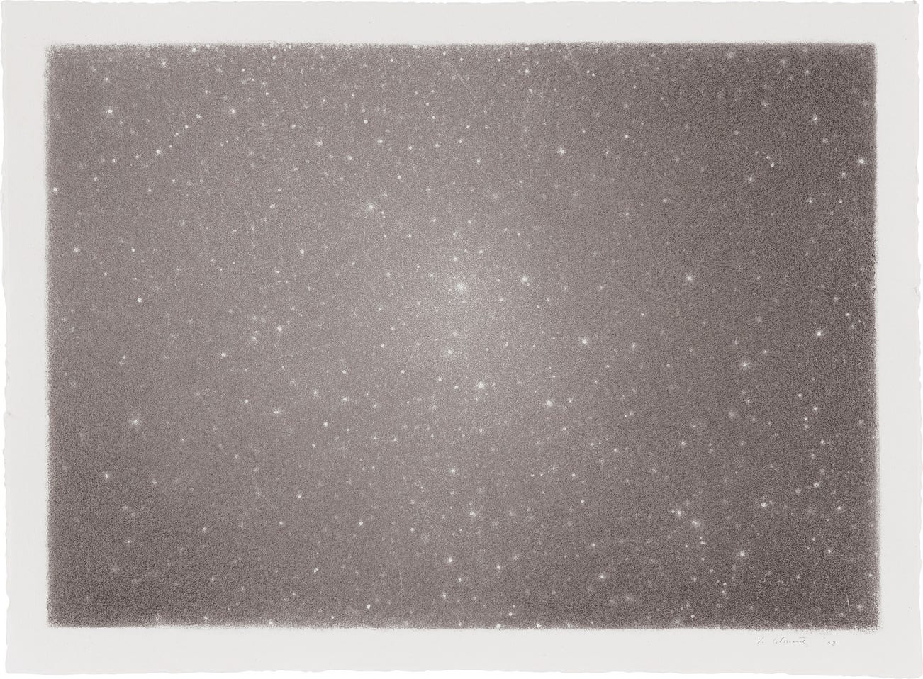 After moving to New York in the early 1980s, Celmins switched back and forth between painting and drawing, returning almost exclusively to drawing in the 1990s, this time in charcoal. As such, Night Sky drawings like the present work were the first of their kind, and also her first major works on paper made in her new home of New York. Here, she switched from graphite and acrylic to charcoal, representing what Joan Storsve called a “radical change” (Joan Storsve, Vija Celmins: Dessins/Drawings, exh. cat., Centre Pompidou, Paris, 2006, p. 24). Applying the same technique of altering the density of the medium to achieve varying degrees of gray-scale, she applied the charcoal directly onto the paper—a method which she referred to as “kind of a relief, because it was dustier and had more relationship with the support”— and used an eraser to etch into the surface the fields of stars, revealing the white surface of the paper beneath (Vija Celmins, quoted in “Oral history interview with Vija Celmins, conducted by Betsy Sussler”, New York, October 18, 2011, p. 32).