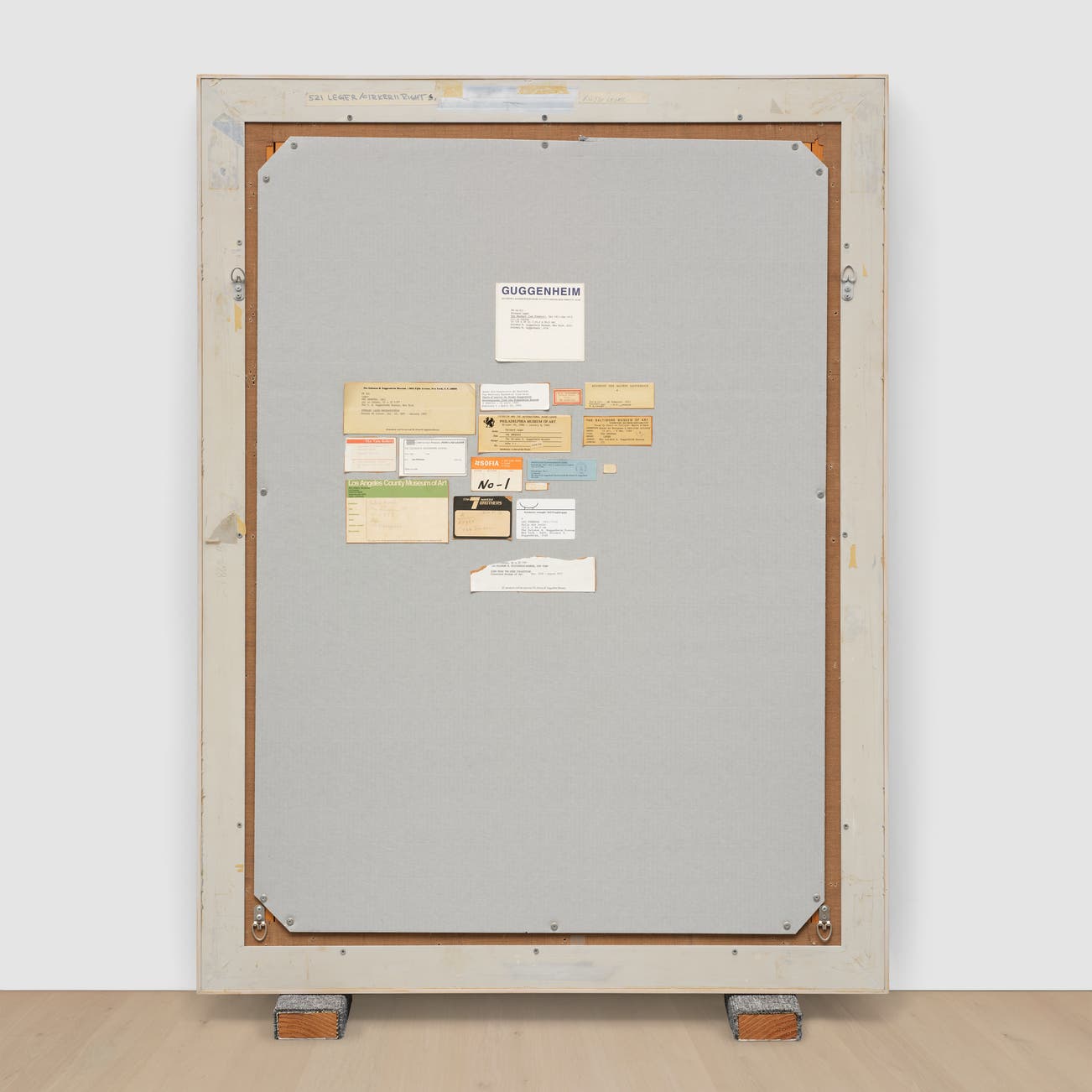 backing board, canvas, wooden stretcher and reproduced labels in artist's frame, with two carpeted wood blocks