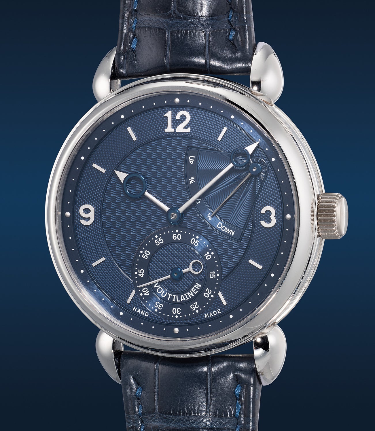 Made in only 25 pieces for Swiss watch retailer A l’Emeraude, the watch was originally offered with an black glossy dial, however the owner requested and obtained a superb blue dial featuring three different hand guilloché patterns. Voutilainen also created a new set of white gold satin brushed hands for optimal legibility specifically for this timepiece. The masculine 39mm platinum case sports Voutilainen’s signature tear drop lugs.