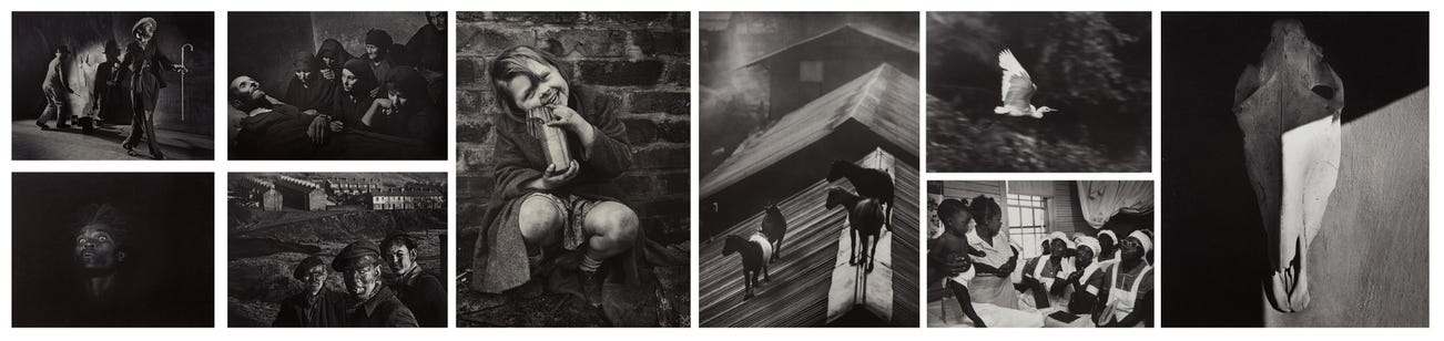Charlie Chaplin, Limelight, 1952; Wake of Juan Carra Trujillo, 1951; Untitled (child sitting), circa 1950; Goats on a Roof, Africa, 1954; Patient in Mental Hospital, Haiti, 1959; Three Generations of Miners. A Welsh Coal-Mining Town, Wales, Great Britain, 1950; Maude in Classroom, 1951; Egret in Flight, Africa, 1954; Skull, New Mexico, 1947