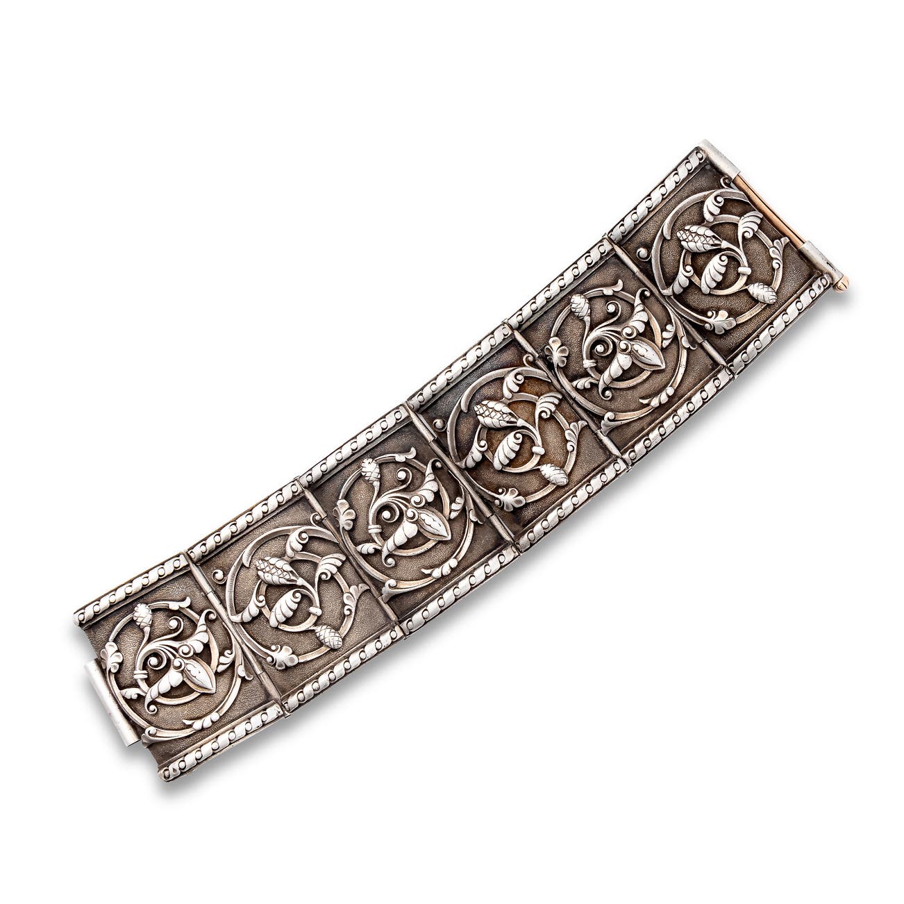 Composed of six panels applied with foliate design, length approximately 170mm, French maker's mark for Jules Wièse and assay marks for silver, fitted case stamped Wiese.