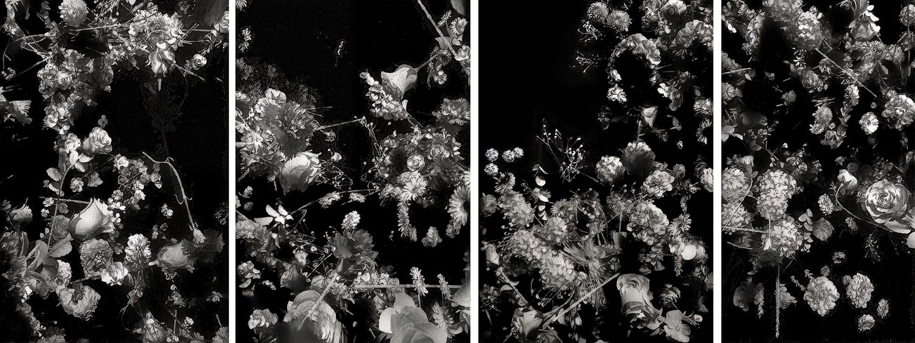 Singapore visual artist Yanyun Chen critically examines the theme of artifice in this striking set of works from her series False Truths. These artworks were created in response to the passing of the Protection from Online Falsehoods and Manipulation Act in Singapore in May 2019. Through them, Chen hopes to urge the viewer to reflect on the difficulties of discerning the truth from fiction. Renowned for her representations of flowers, Chen employs the charcoal aesthetic of her previous works but injects a sense of artificiality. Collaborating with visual effects artist Alex Scollay, Chen tapped into AI technology to create computer-generated models of flowers. Adding to the sense of deception, plastic and silk flowers are hidden amidst real, withering flowers.
