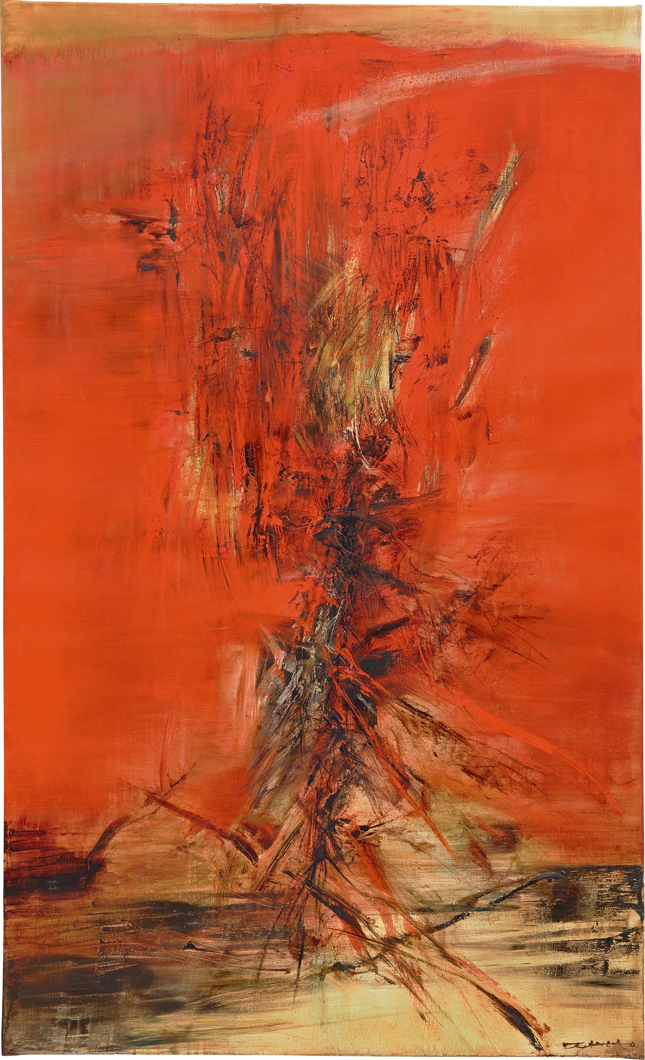 1960年代的「狂草時期」畫作反映了這場顛覆了趙無極生活的動盪,同時也表現出對安寧的嚮往。《22.6.63》和《24.10.63》體現趙無極獨特的構圖技巧,激盪的線條在莊嚴的靜謐中席捲而上,充斥著整個氛圍,與原始和混沌搏鬥。筆法宏偉、霸氣且鏗鏘有力—《22.6.63》的墨黑色筆觸在深紅色背景前,傳遞出畫布底下旺盛、搏動的潛能,而在《24.10.63》中稀疏飛揚的筆觸,以鮮明的黑色和棕色色調,與鮮亮的猩紅色漬形成對比,是向波洛克最著名的行動繪畫作品《第1A號》(1948年)中央的紅點表示致敬。兩幅畫的邊緣都出現一條裸露的水平深黑色和沙色,製造出強烈的深度感 和遠在狂風暴雨之外的一瞥寧靜。垂直的形式強化了壓迫感,而相互交錯的油彩和筆觸,充滿了視覺上的衝擊,這巨大空間之中強大的勁頭和動能,使觀者產生身陷其中的強烈感受。